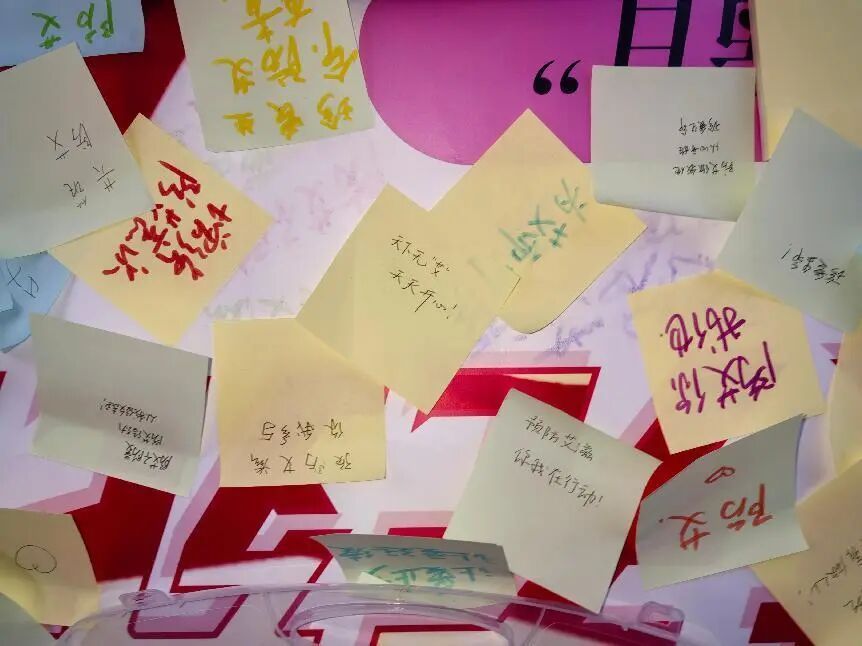 书写者们有的蹲下执笔,有的俯身书写,他们都用彩笔写下了“防艾从我做起”“愿所有防艾的善意都能抵达人心”等许许多多温柔的话语,当活动结束时,桌子上贴满了五颜六色的彩色便利贴,上面写满了同学们对艾滋病患者想说的话语和对“天下无艾”的期望。那一张张小小的便利贴,像一簇簇温暖的火苗,把理解与善意积攒在了一起,也让防艾的声音传的更久。