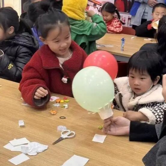 从小心翼翼裁剪纸杯底部,到将气球口与纸杯精准贴合固定,每个步骤都考验着孩子们的动手能力与耐心。遇到“气球易脱落”、“裁剪不平整”等问题时,志愿者们手把手协助,鼓励大家尝试。当一个个专属热气球完成,孩子们兴奋地展示成果,真切感受到“作用力与反作用力方向相反”的科学魅力。